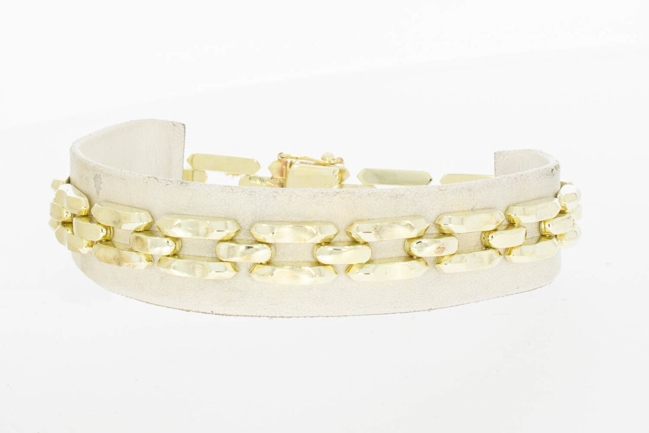 In zeer goede staat; 14 karaat geel gouden brede Staafjes schakelarmband met bakslot en dubbele veiligheidsclips - 21,5 cm.